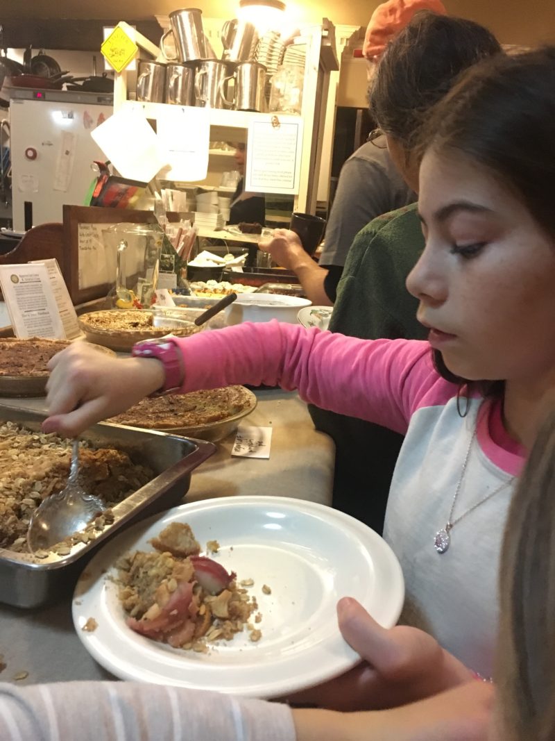 Snowy weather tends to get me in the holiday spirit and this storm coincided nicely with Christmas songs hitting the airwaves. Although, at Dancing Rabbit, we are less into the consumerism of the holiday season, we certainly do enjoy the gratitude and connection aspects. For Thanksgiving, the tri-communities (Dancing Rabbit Ecovillage, Red Earth Farms, and Sandhill Farm) came together for the annual potluck dinner where we shared both blessings and food. After dinner, the Milkweed Mercantile hosted a dessert potluck featuring goodies such as vegan cherry pie, gluten-free apple crisp, pumpkin cheesecake, and good old-fashioned brownies. Even though I couldn’t imagine even one more bite after my hefty Thanksgiving meal, I managed to sample more than a few of these treats.