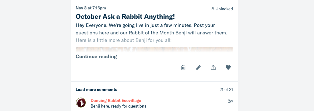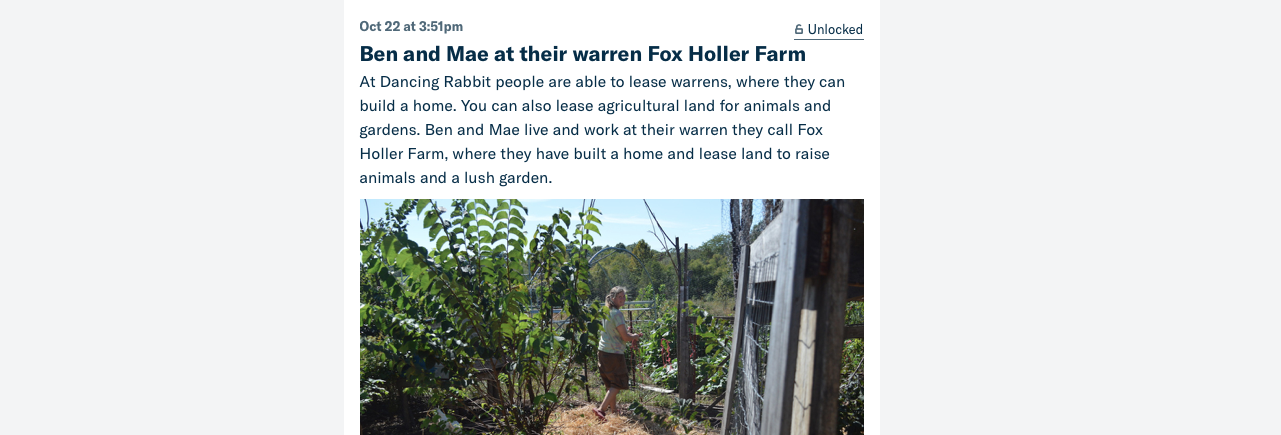 In the month since we launched our page, we have had so much fun with posting those awesome insider pictures and doing our first monthly “Ask Me Anything.” Benji was able to answer all of our patrons’ questions. It has been such an enjoyable avenue for engaging with supporters of Dancing Rabbit. I hope these pictures and insights will show the world that living lightly with a low-carbon footprint is a rewarding way to live on this planet we all share.
